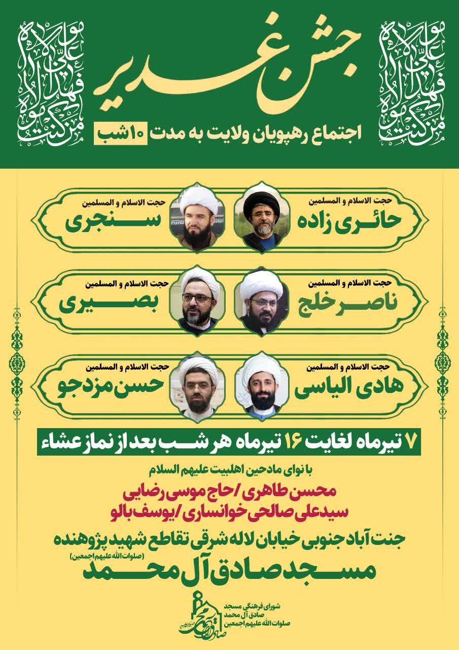 جشن غدیر در مسجد صادق آل محمد(ص) واقع در جنت آباد جنوبی، خیابان لاله شرقی از ۷ تا ۱۶ تیر ماه بعد از نماز مغرب و عشاء با سخنرانی حجج سلام حائری زاده، سنجری، خلج، بصیری، مزدجو و الیاسی بعد از نماز مغرب و عشا برگزار می شود. در این مراسم محسن طاهری، موسی رضایی، سیدعلی خوانساری و یوسف بالو به مداحی و ذکر مناقب امیرمومنان(ع) می پردازند.